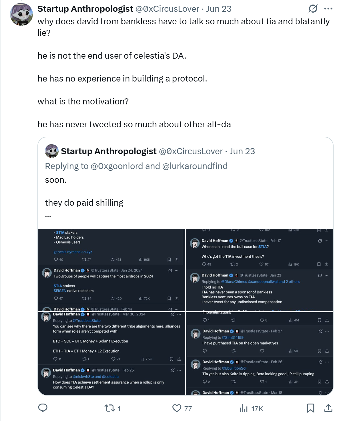 Al-Bassam’s post likely came in response to a scathing X thread by Startup Anthropologist. The post, which attracted over 200,000 views, accused the Celestia team of coordinated financial misconduct.