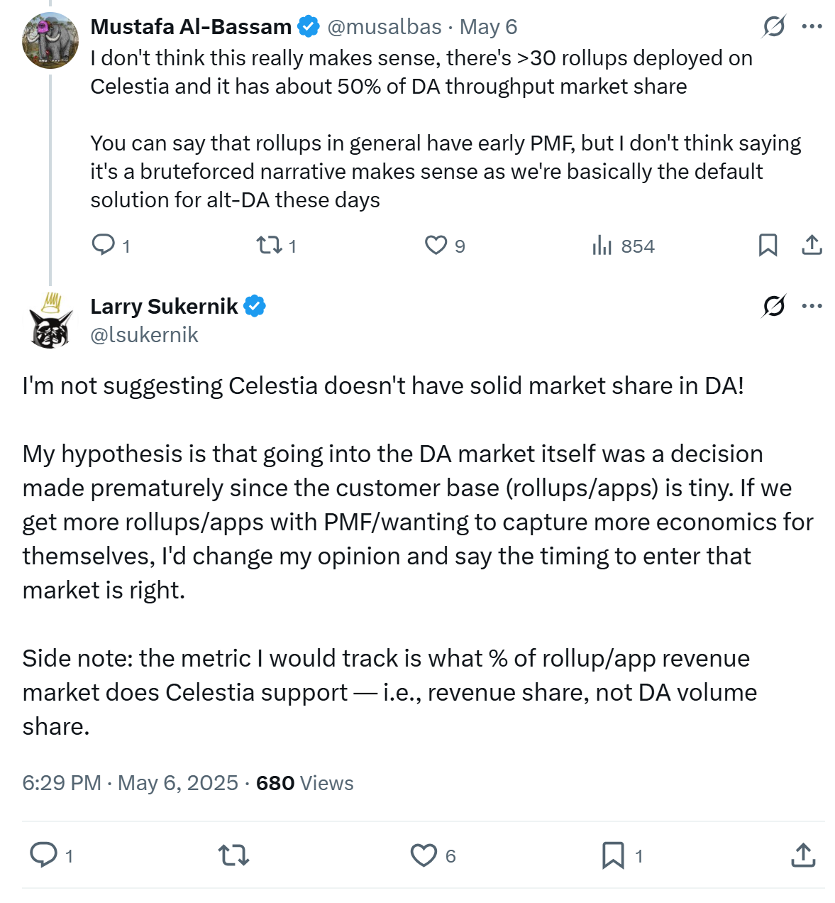 Despite that, Sukernik questioned whether Celestia jumped into the DA space prematurely, given the still-nascent demand from rollups. He noted that while Celestia has market share, it may not translate into real economic traction.