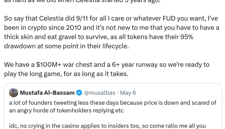 Celestia co-founder Mustafa Al-Bassam claimed that the team remains committed and financially equipped to weather the storm despite escalating accusations of misconduct, insider profit-taking and community mistrust.