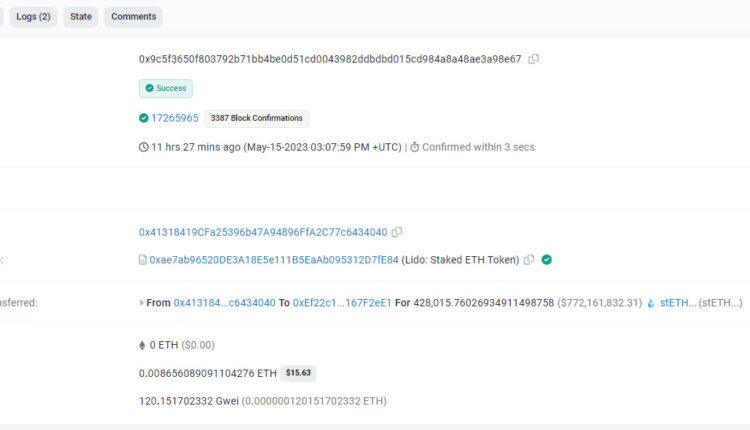 On May 15, a transaction was identified on Celsius wallets for 428,015 stETH (Lido staked Ether) to the Lido staked Ethereum wallet. The whopping stash was worth $781 million at the time of transfer which some believe is in preparation for withdrawal.