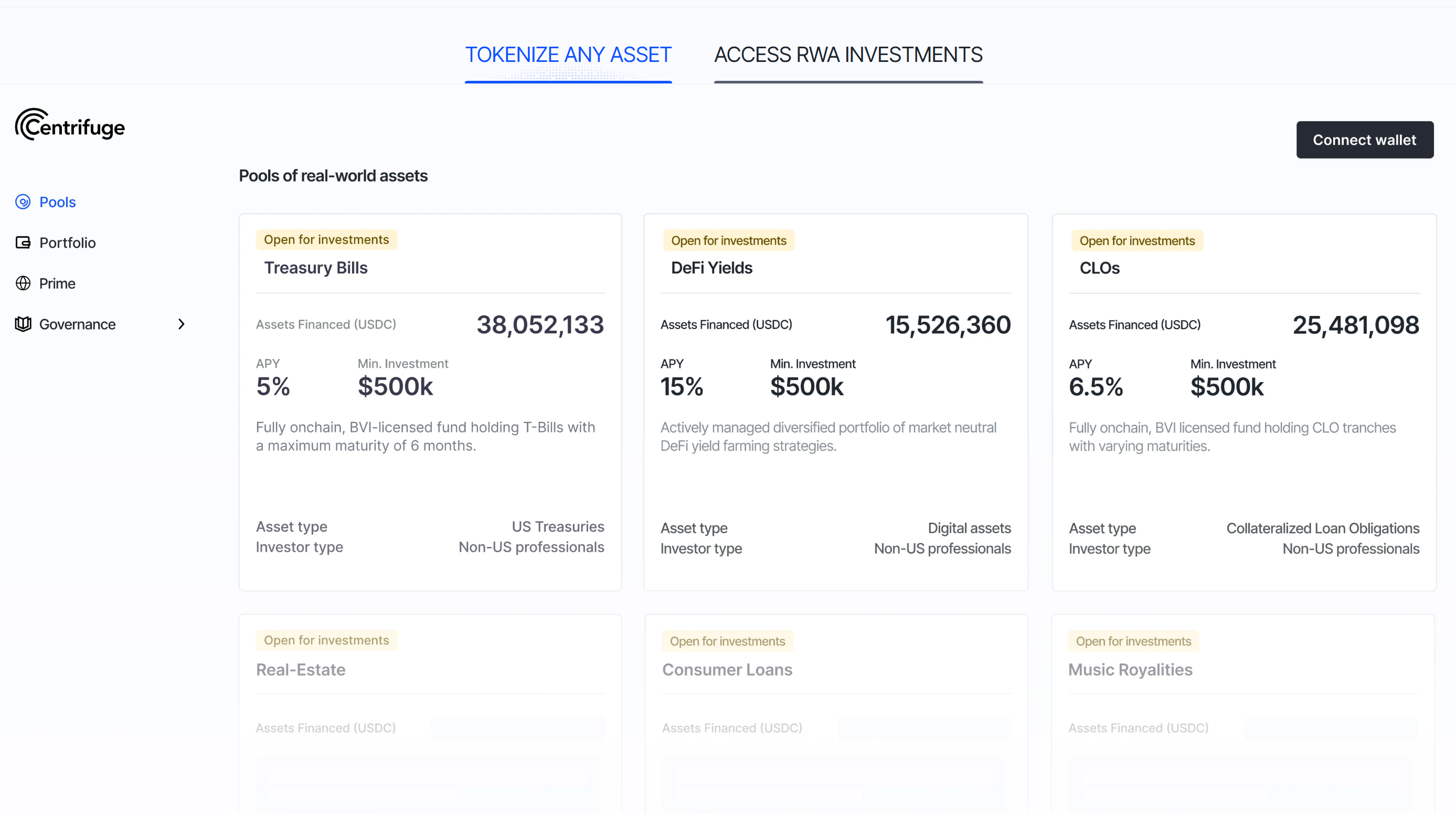 Centrifuge offers tokenized real-world asset pools for investors. Source: Centrifuge