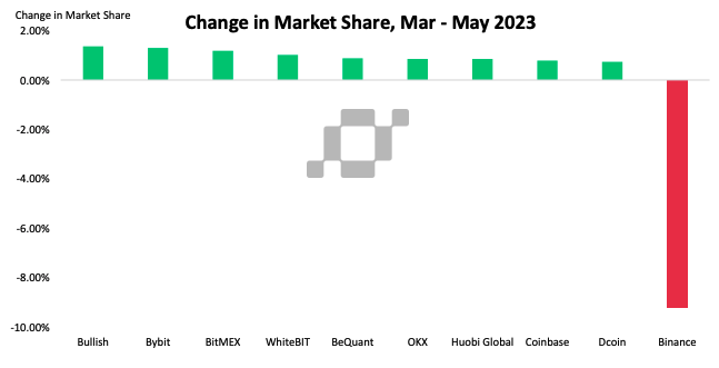 The largest beneficiaries of Binance’s market share slide were crypto exchanges Bullish, Bybit and BitMEX, which each gained a little more than 1% in market share between March and May.