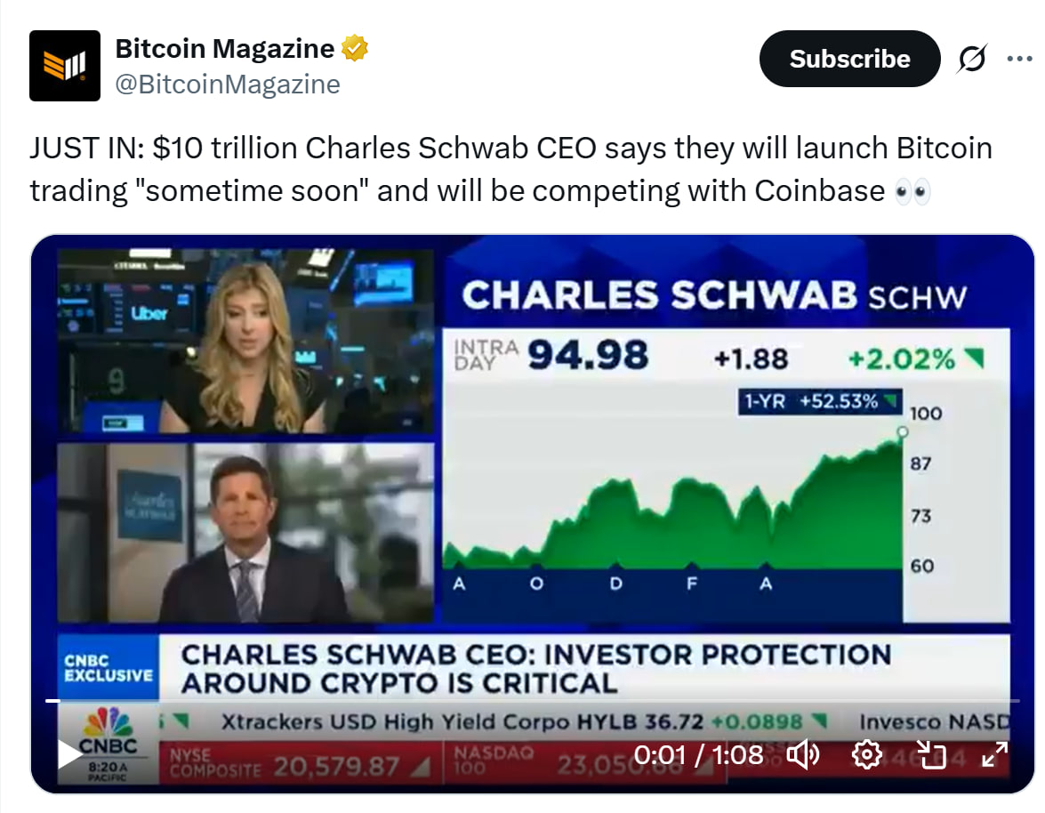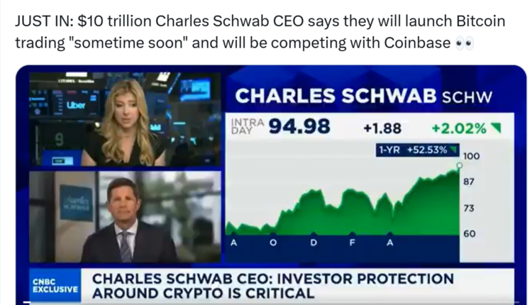 Charles Schwab to Launch Bitcoin and Ether Spot Trading, CEO Confirms