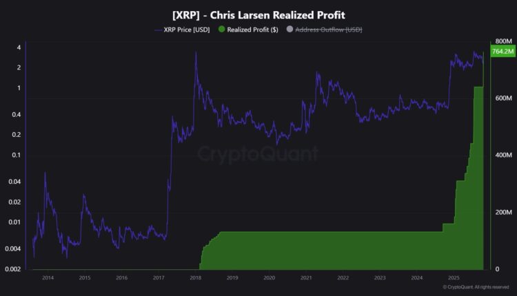 Following up on the topic, Maartunn shared a chart revealing that Larsen’s realized profit from his XRP withdrawals has expanded significantly in 2025, rising to $764.2 million from under $200 million more than seven years ago.