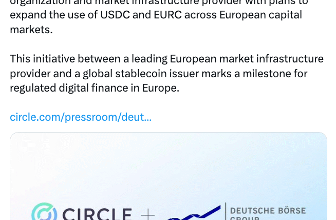According to the announcement, Circle and Deutsche Börse’s collaboration is enabled by the European Union’s Markets in Crypto-Assets Regulation (MiCA) framework, which entered into full force in late 2024.
