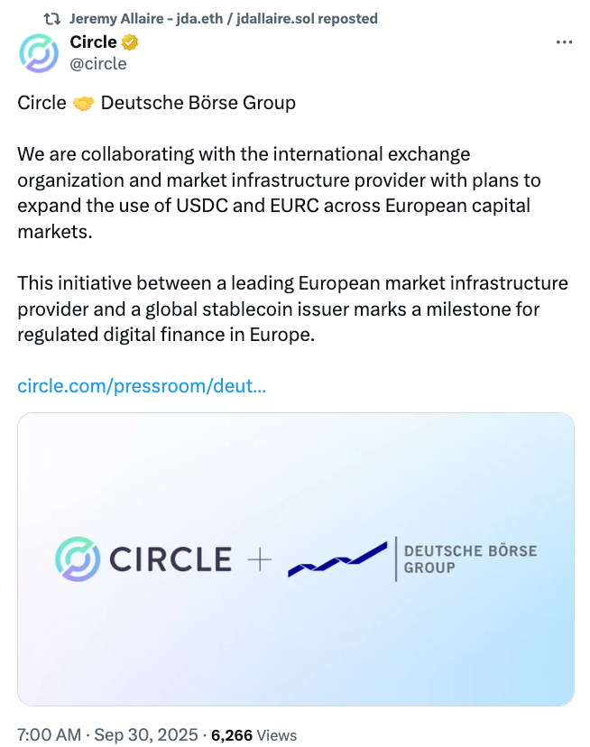 Deutsche Börse Group and Circle Internet Group have signed a memorandum of understanding to integrate Circle’s stablecoins within Deutsche Börse’s financial market infrastructure, according to a joint announcement on Tuesday.