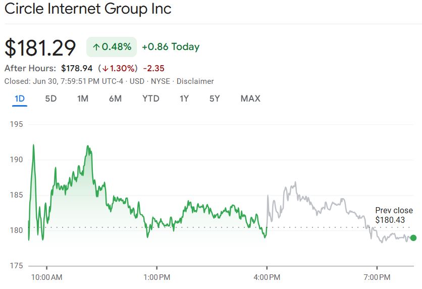 Circle Internet Group (CRCL) shares have traded flat in the last trading session, rising 0.48% to $181, Google Finance data shows. In after-hours trading, the stock dropped 1.30% to $178.