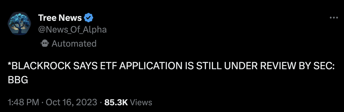 Earlier today, during routine coverage, Cointelegraph’s social media team posted a message on X without prior editorial approval stating that the United States Securities and Exchange Commission had approved BlackRock’s iShares spot Bitcoin exchange-traded fund, or ETF. This was false, the result of misinformation. The news lead originated from an unconfirmed screenshot posted by an X user who claimed it was from the Bloomberg Terminal.