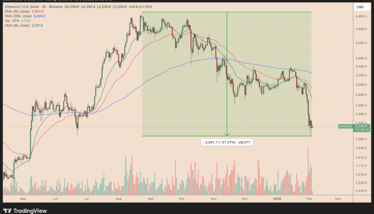 The price of Ethereum’s native token, Ether (ETH), risks sliding below $2,000 in February as a classic bearish setup plays out.