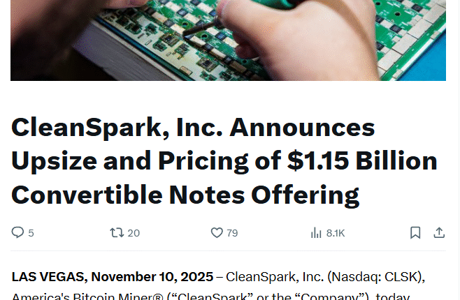 Cleanspark said it will use $460 million of the proceeds to repurchase common stock from investors, while the remaining proceeds will be used to expand the company’s power and land portfolio, develop data center infrastructure, repay its outstanding Bitcoin-backed credit balances, and cover general corporate expenses.