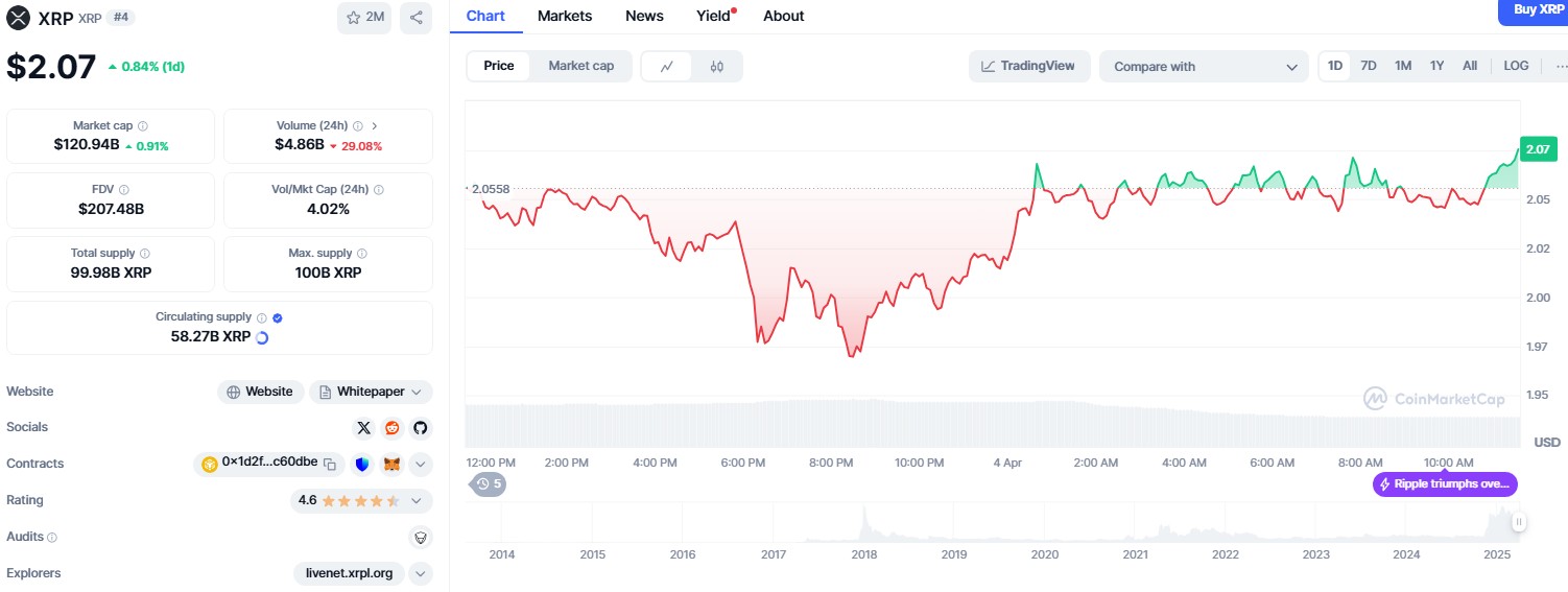 At present time, XRP was trading slightly above $2 with minimal intraday volatility. The coin’s relatively stable performance contrasts with the broader crypto market, where prices have remained highly reactive to macroeconomic signals and regulatory updates.