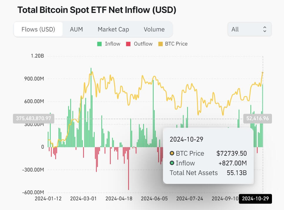 The real-time deposit comes as spot Bitcoin exchange-traded funds (ETFs) saw inflows reaching $827 million yesterday, according to data from CoinGlass.