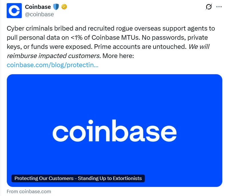 The attackers have been approaching the exchange’s overseas customer support agents for months, aiming to “bribe” them in exchange for customer information, said Coinbase co-founder and CEO Brian Armstrong in a May 15 X post.