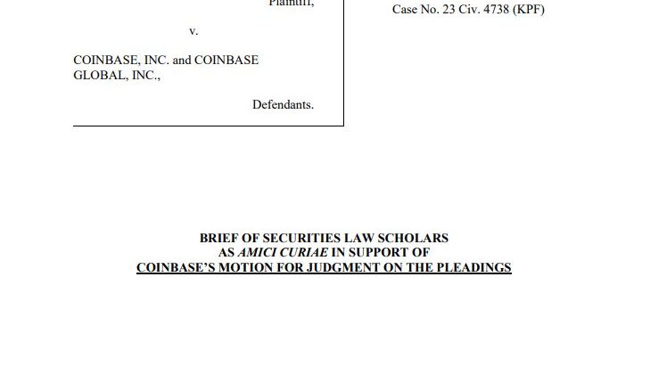 A group of six legal scholars specializing in securities law and related domains have submitted an amicus brief in favor of crypto exchange Coinbase in its legal battle against the U.S. Securities and Exchange Commission (SEC).