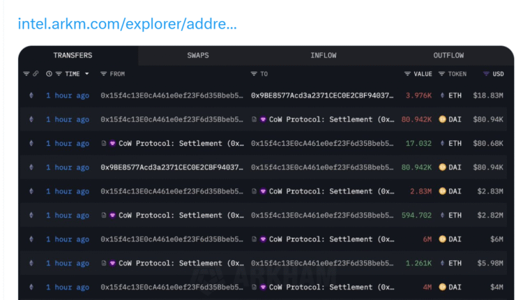 The purchase was made on Saturday, using 18.911 million DAI (DAI), according to data from Arkham Intelligence. The hacker consolidated various DAI amounts, ranging from $80,000 to $6 million, before executing multiple ETH buys.