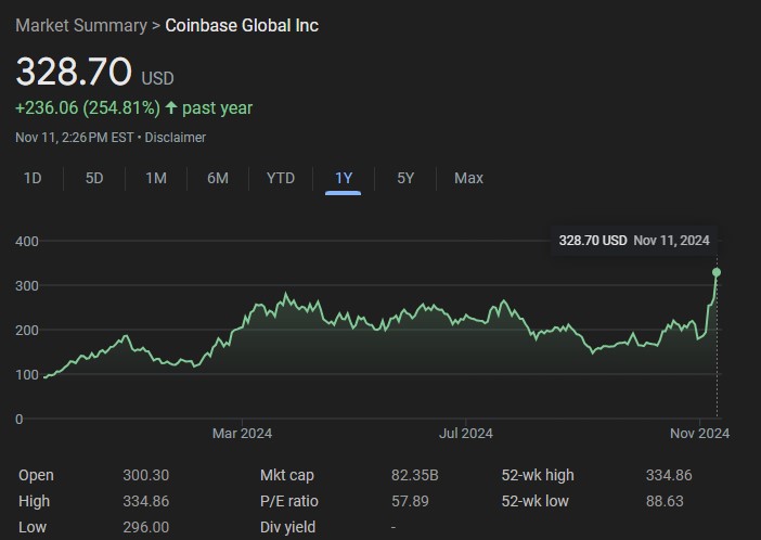 Shares of cryptocurrency exchange Coinbase Inc. (COIN) surged more than 20% on Nov. 11, pushing the stock past $300 for the first time since 2021.