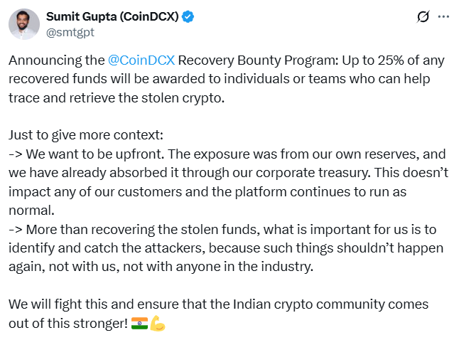 In an effort to recover the stolen funds, CoinDCX CEO Sumit Gupta announced a new recovery bounty program that offers white hat hackers up to 25% of any recovered funds they can help trace and retrieve.