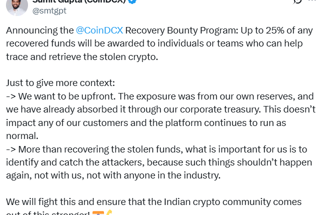 In an effort to recover the stolen funds, CoinDCX CEO Sumit Gupta announced a new recovery bounty program that offers white hat hackers up to 25% of any recovered funds they can help trace and retrieve.