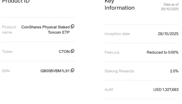 The new product, CoinShares Physical Staked Toncoin, started trading on Switzerland’s primary stock exchange SIX under the ticker CTON on Tuesday.