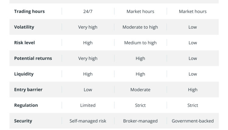 Taxes add another layer of complexity. Stocks and bonds typically fall under capital gains and dividend tax rules, with clear guidelines based on how long you’ve held them. Crypto tax laws vary widely by country. Some countries treat it like property, others like a commodity, and a few don’t tax it at all. Keeping track of every transaction is crucial, as even swapping one crypto for another can be taxable.