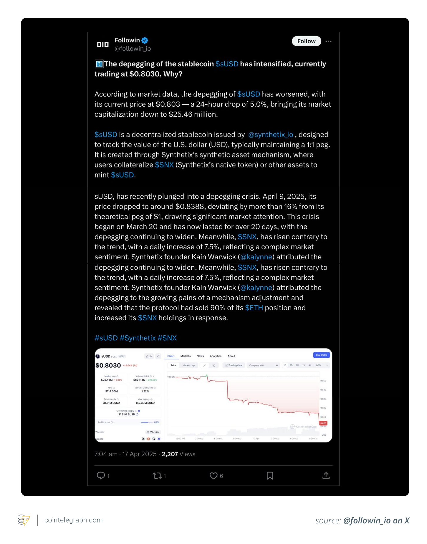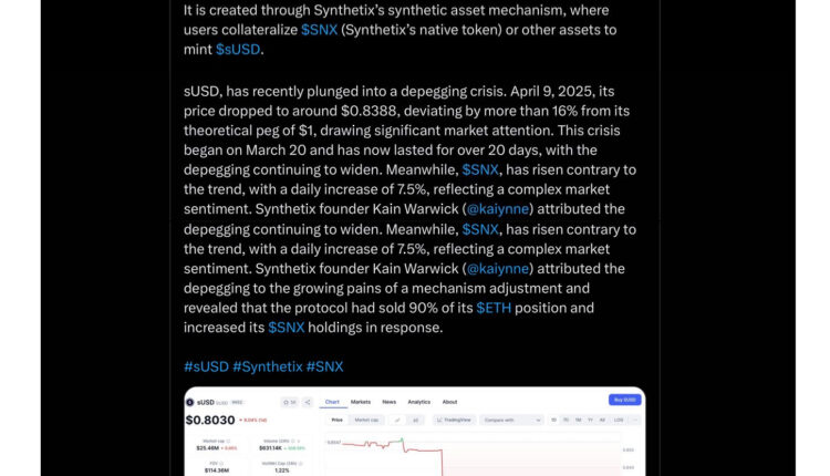 In a significant and concerning event in the cryptocurrency space, sUSD, the native stablecoin of the Synthetix protocol, saw its value plummet to $0.68 on April 18, 2025.