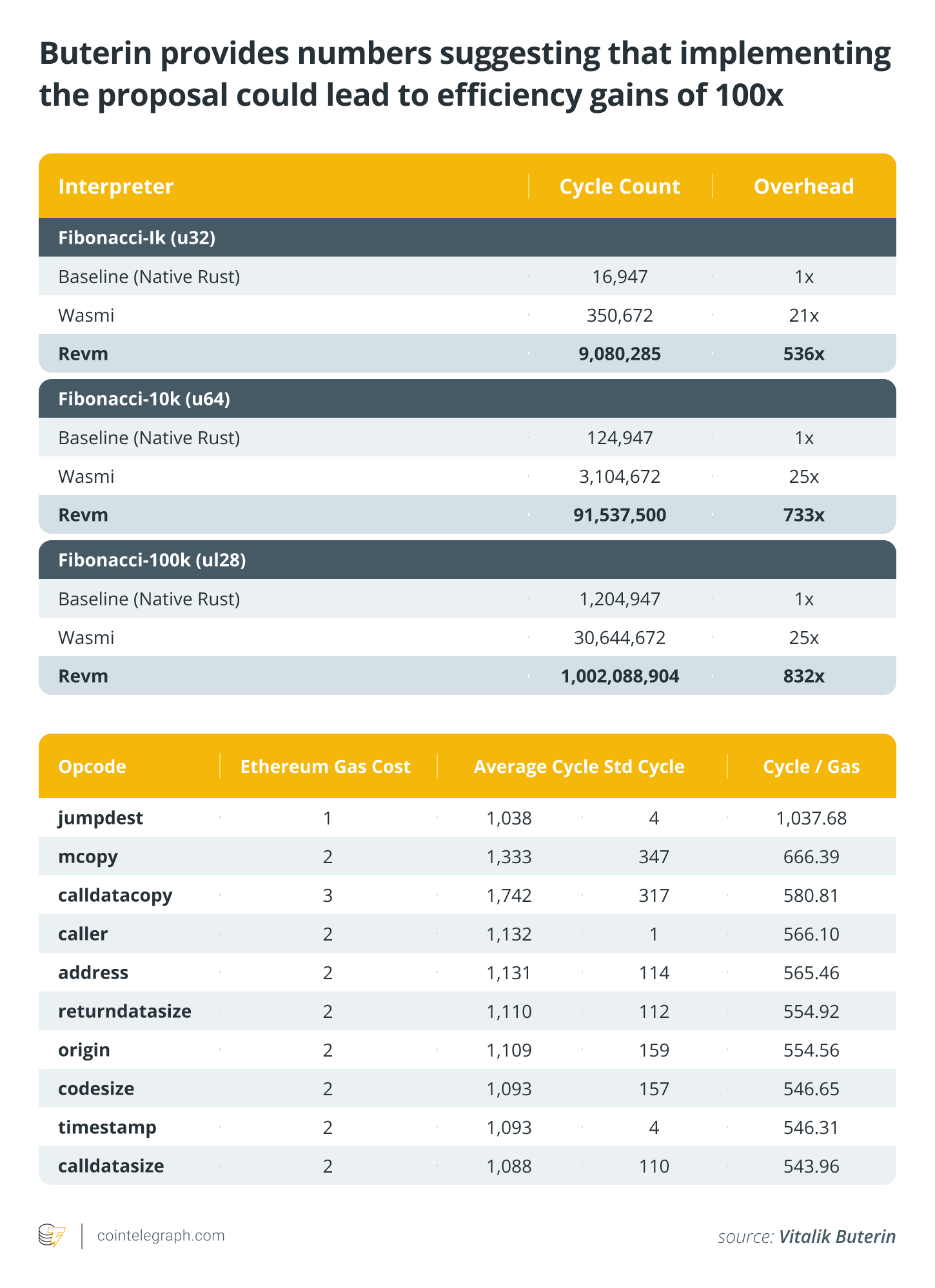 According to Buterin, the new architecture could theoretically deliver efficiency gains of 100x; in reality, this number will be hard to reach, but gains would still be significant. The efficiency gains are tied to RISC-V’s suitability for both zero-knowledge (ZK) proof systems and general smart contract execution, as it eliminates EVM overhead.