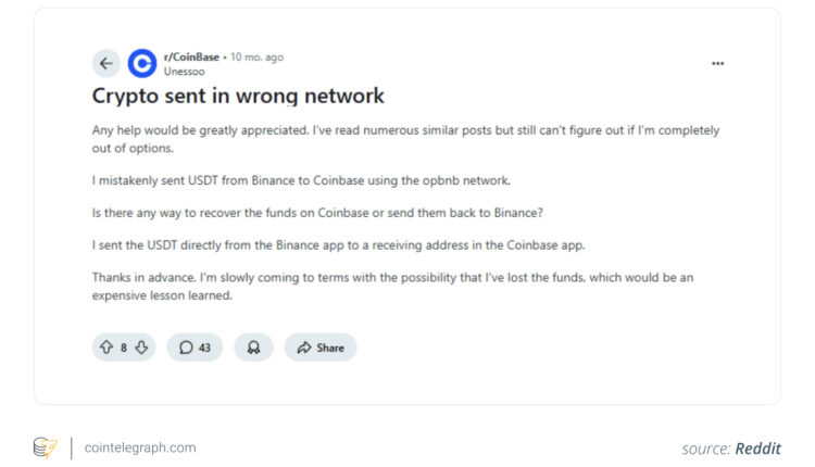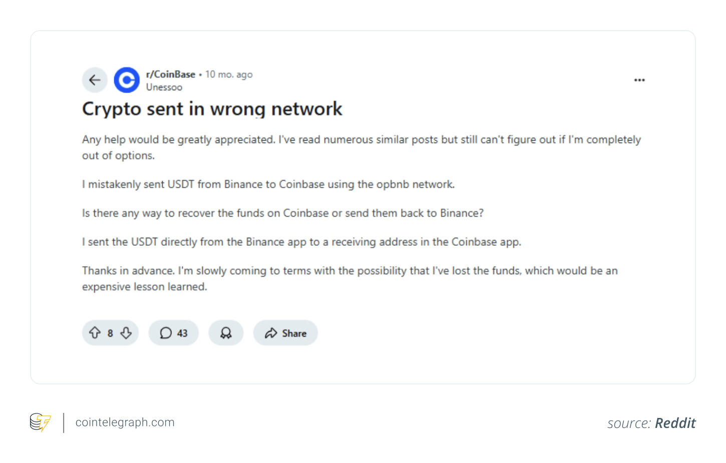 Sending tokens on the wrong network — like Ethereum instead of BNB Chain — can result in permanent loss. One user learned this the hard way (as shown in the image above) after transferring crypto to Coinbase from Binance using an unsupported network.
