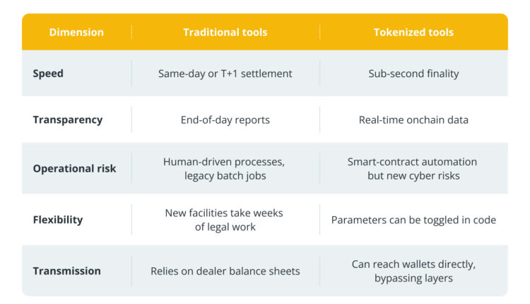 A tokenized system settles atomically in seconds, keeps an immutable audit trail and lets policy adjustments propagate without waiting for dealers to book trades. The BIS paper on tokenisation notes that combining assets and settlement on a single ledger can shrink operational risk and latency.
