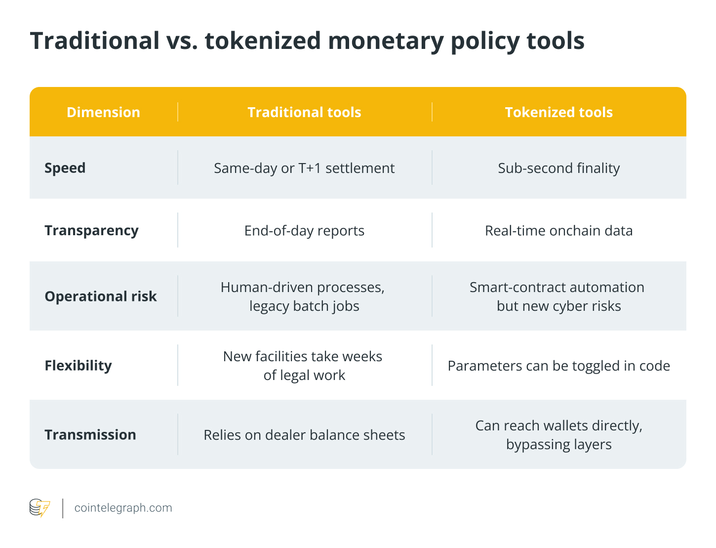 Traditional policy operations rely on central bank systems such as Fedwire or the Bank of England’s RTGS. These systems close overnight, settle in discrete batches and require multiple human sign-offs.