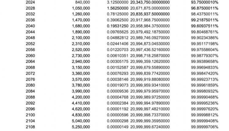 According to current estimates, 99% of all Bitcoin will have been mined by 2035, but the final fraction — the last satoshis — won’t be produced until around the year 2140 due to the nature of geometric reward reduction.