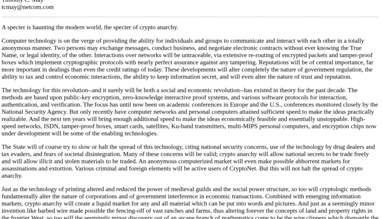 The document described encrypted exchanges that ensured total anonymity, freedom of speech and the freedom to trade, dating back to 1988. Most of the spotlight in crypto nowadays is on institutional adoption, regulatory breakthroughs and financial speculation, but the crypto community never stopped building for digital rights and privacy.