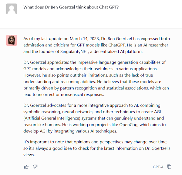 ChatGPT-4 hasn’t been updated recently enough to tell us what Goertzel thinks in the past three weeks