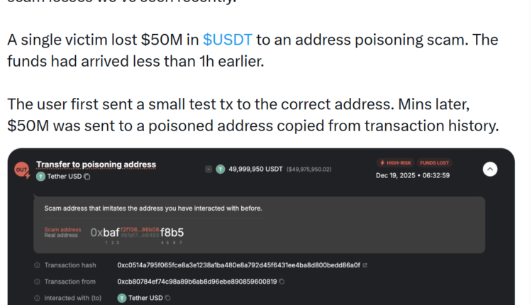 A single transaction error led to one of the largest onchain losses seen this year, after a user mistakenly sent nearly $50 million in USDt to a scam address in a classic address poisoning attack.