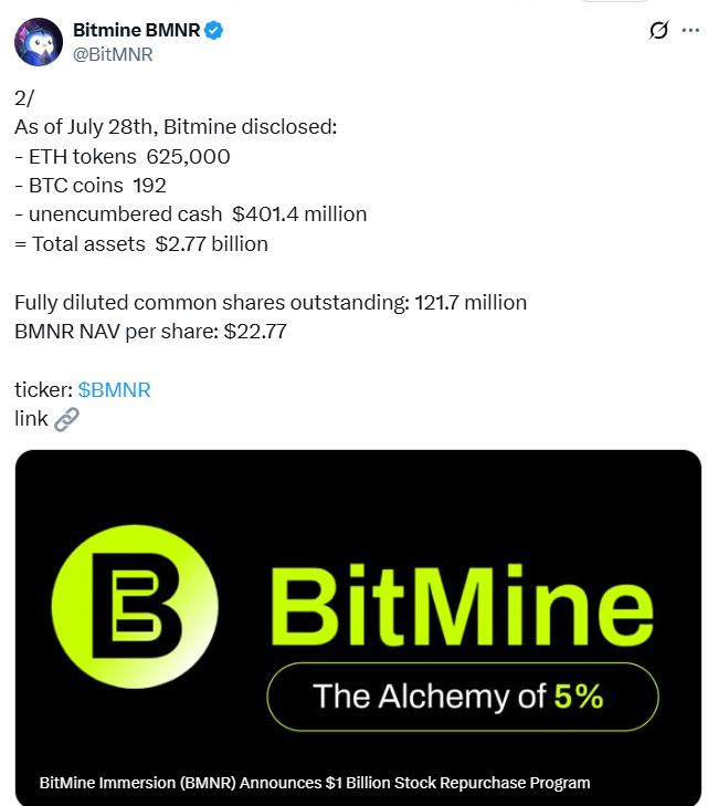 Publicly-listed Bitcoin mining company, BitMine Immersion Tech is currently the largest Ether treasury firm, holding 625,000 Ether tokens, or 0.52% of the total circulating ETH supply, the firm announced as part of a $1 billion stock repurchase program on Tuesday.