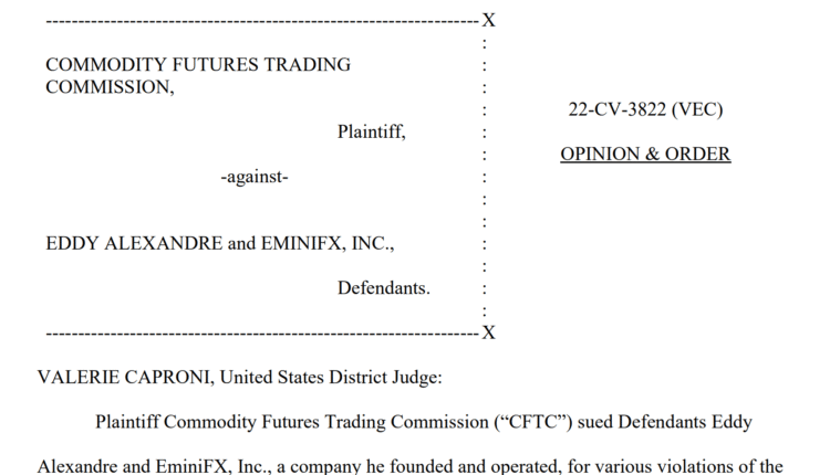 The US Commodity Futures Trading Commission (CFTC) secured summary judgment against Alexandre and EminiFX, with US District Judge Valerie Caproni holding them jointly liable for more than $228 million in restitution and an additional $15 million in disgorgement, according to a Tuesday court filing.