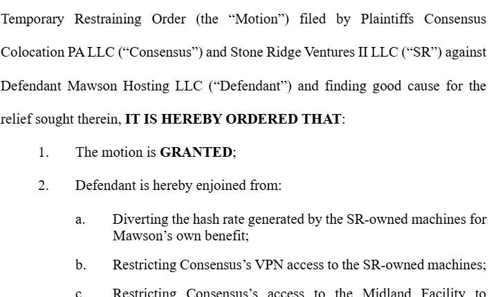 Vice Chancellor Morgan Zurn granted a temporary restraining order on March 12, requested by Bitcoin miner Consensus Colocation and systems owner Stone Ridge Ventures against Mawson Hosting, which provides hosting and colocation services for Bitcoin miners.
