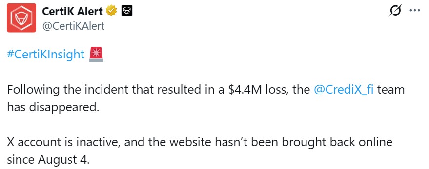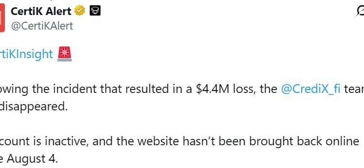 The team behind the decentralized finance (DeFi) protocol CrediX Finance appears to have disappeared following a $4.5 million exploit that drained funds from the platform, raising concerns of a suspected exit scam.
