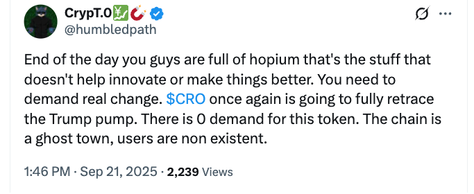 “You need to demand real change. $CRO once again is going to fully retrace the Trump pump. There is 0 demand for this token. The chain is a ghost town, users are non-existent,” one commentator wrote on X on Sunday.
