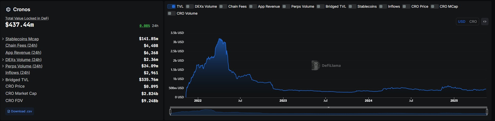 Cronos has a total value locked of nearly $440 million. Source: DefiLlama