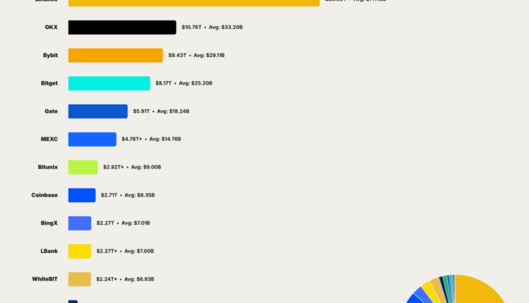 OKX, Bybit and Bitget followed, each posting $8.2 trillion to $10.8 trillion in yearly volume. These four exchanges accounted for about 62.3% of total market share.