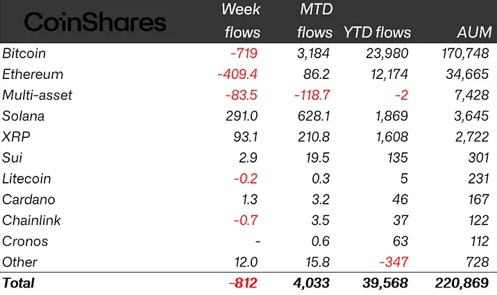 Global crypto exchange-traded products (ETPs) recorded $812 million of outflows in the week ending Friday, ending a two-week run of inflows, CoinShares reported on Monday.