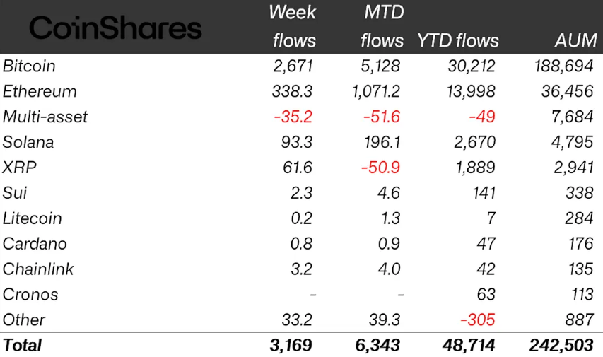 In addition to robust weekly inflows, crypto funds reached a new milestone by surpassing total inflows recorded last year, climbing to $48.7 billion year-to-date.