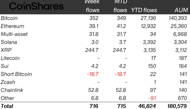 Crypto exchange-traded products (ETPs) attracted $716 million in inflows last week, adding to the previous week’s gains of $1 billion, European crypto asset manager CoinShares reported Monday.