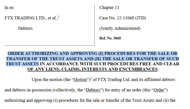 Order authorizing FTX Trading to sell trust assets. Source: Kroll