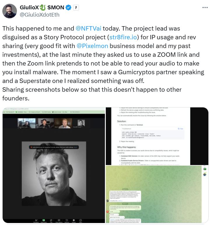 Giulio Xiloyannis, co-founder of the blockchain gaming Mon Protocol, said scammers tried to dupe him and the head of marketing with a meeting about a partnership opportunity.