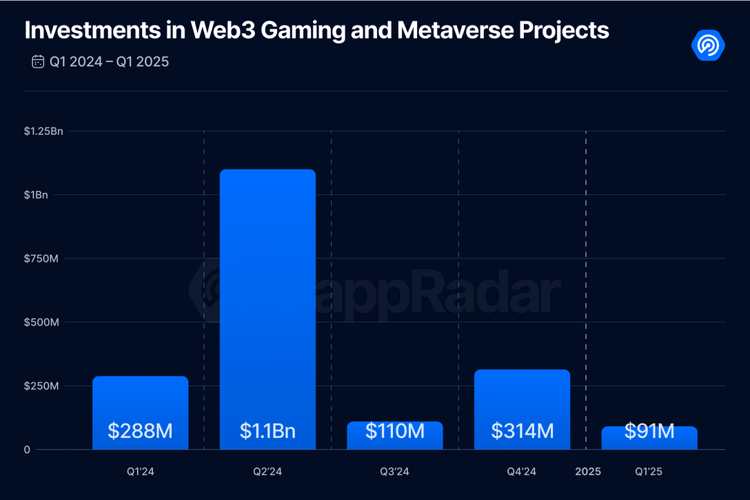 Web3 gaming projects raised $91 million in Q1 2025, marking a 71% decrease from the fourth quarter of 2024 and a 68% drop compared to the same quarter a year ago, DappRadar said in its April 10 State of Blockchain Gaming report.