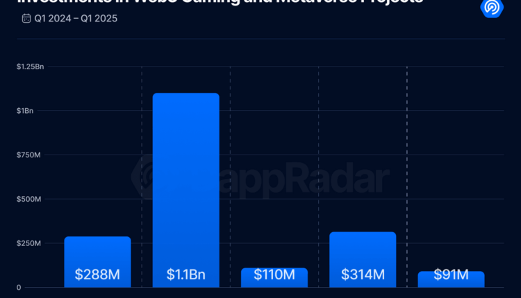 Web3 gaming projects raised $91 million in Q1 2025, marking a 71% decrease from the fourth quarter of 2024 and a 68% drop compared to the same quarter a year ago, DappRadar said in its April 10 State of Blockchain Gaming report.