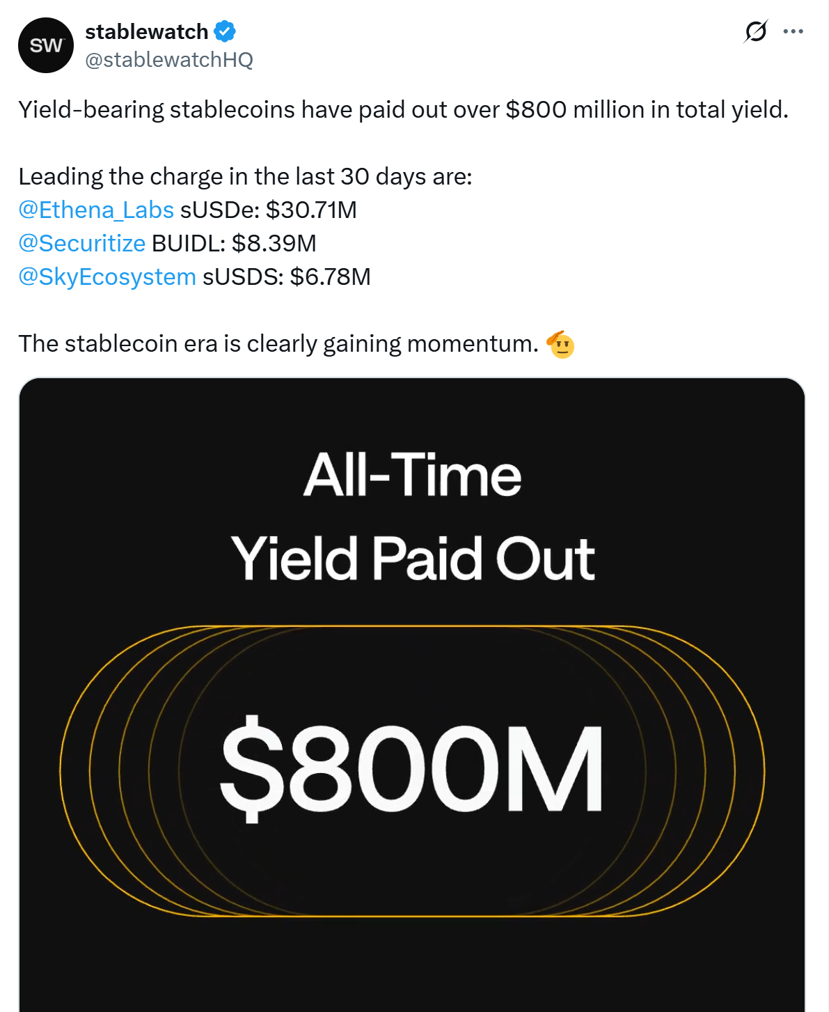 Yield-bearing stablecoins have distributed over $800 million in total returns to holders so far, according to a recent post by StableWatch. Over the past 30 days, Ethena Staked USDe (sUSDe) led payouts with $30.71 million, followed by Securitize’s BUIDL at $8.39 million and Sky Ecosystem’s staked USDe (sUSDe) with $6.78 million.