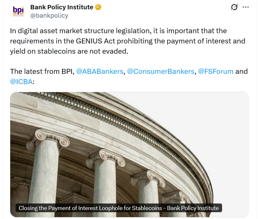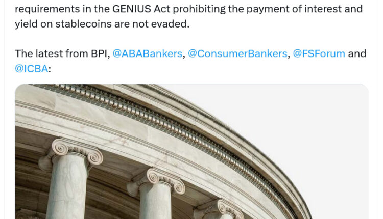 As reported, several US banking groups, led by the Bank Policy Institute (BPI), have urged Congress to tighten the GENIUS Act by closing what they call a loophole that could allow stablecoin issuers and their affiliates to pay yields indirectly.