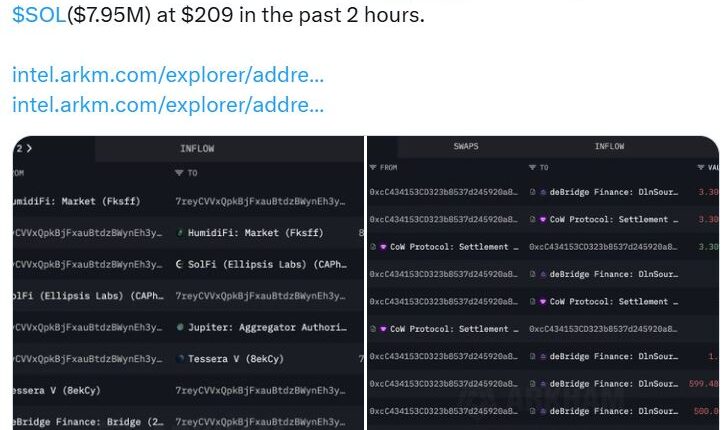 According to Lookonchain, the hacker converted DAI (DAI) to USDC (USDC), then bridged to the Solana network and bought 38,126 Solana (SOL) near the $209 mark across multiple purchases.